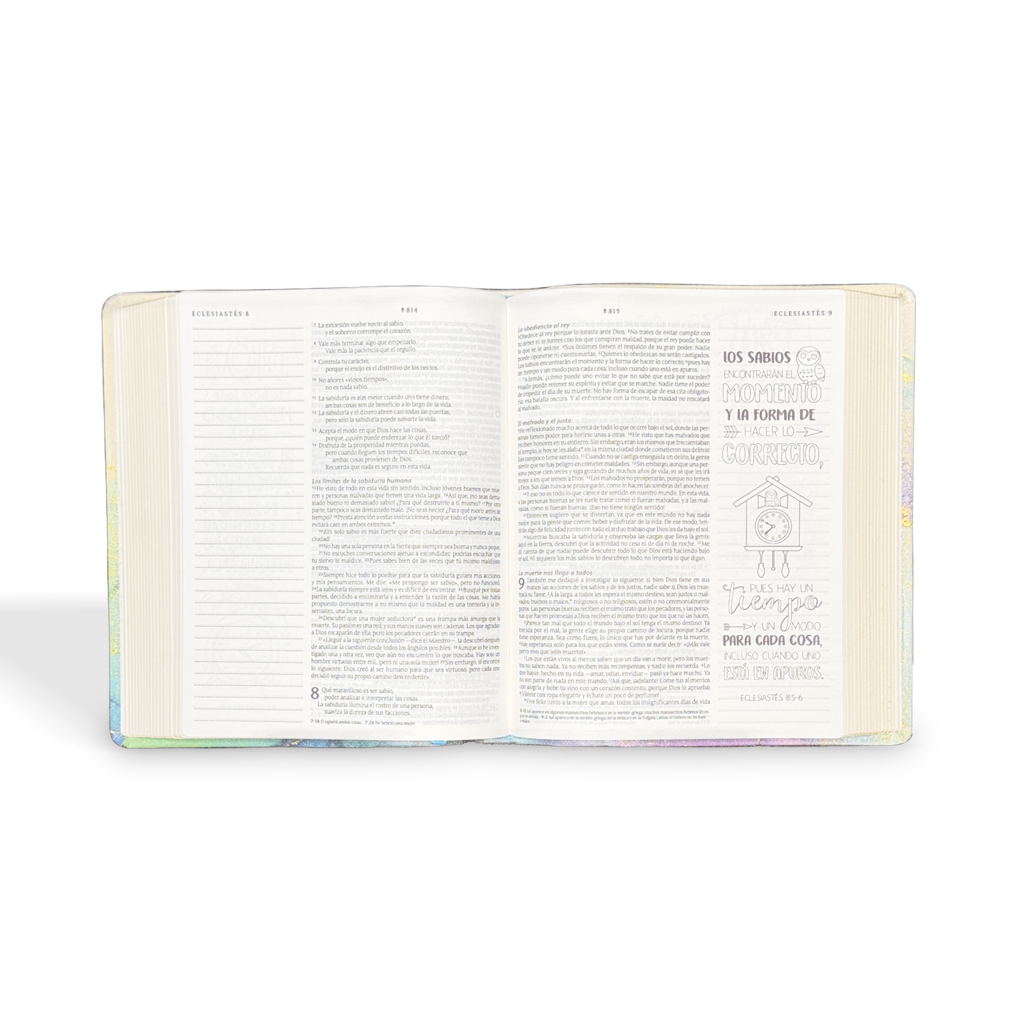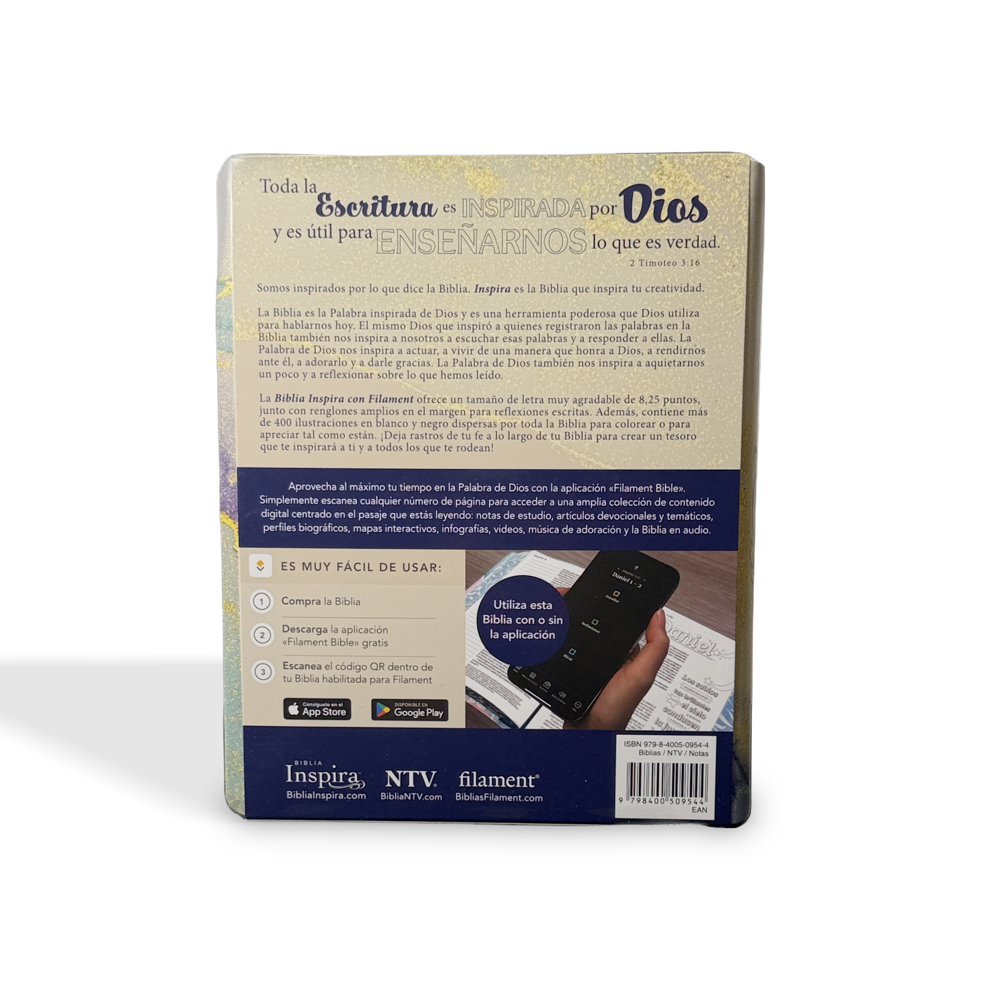 La Biblia Inspira NTV utiliza la expresión creativa para conectarte con Dios y con las Escrituras. Esta Biblia de una sola columna con amplio margen para anotaciones contiene más de 400 hermosas ilustraciones creadas por artistas latinoamericanos para colorear e inspirar la creatividad mientras lees la Palabra de Dios.